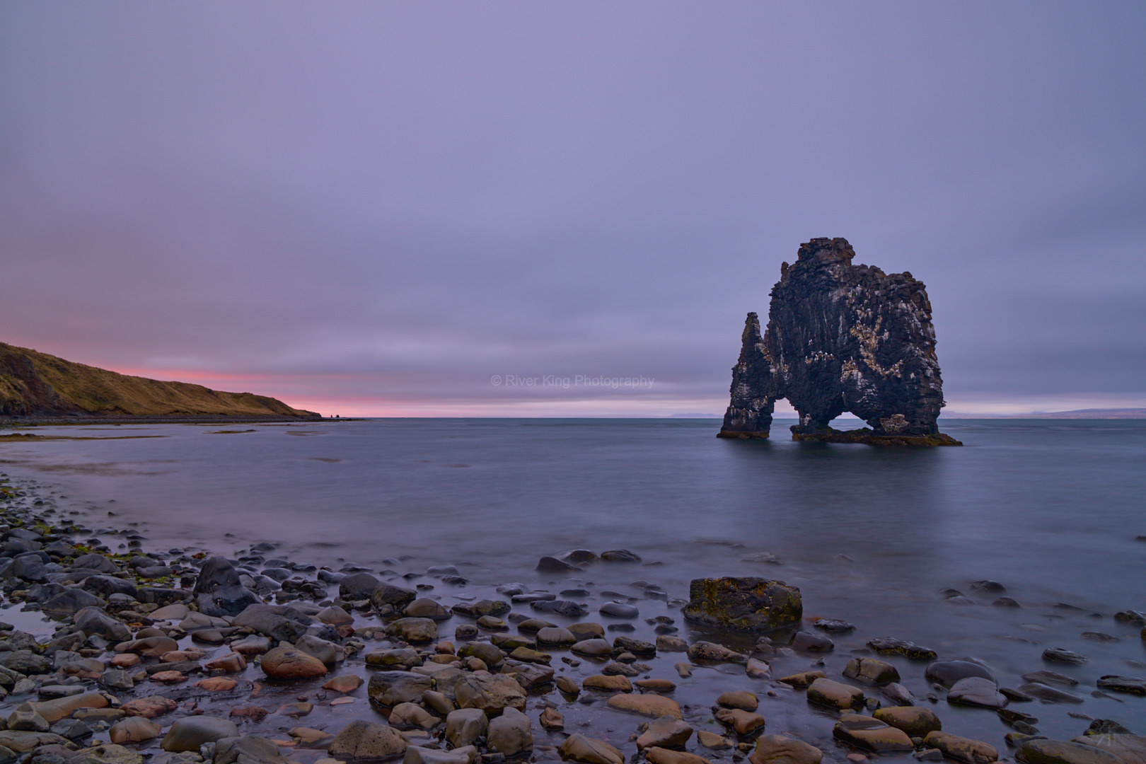 Today was probably the most exhausting day of my Iceland road trip, with a total journey time of over 16 hours, and two-thirds of the route being on unpaved roads, requiring a high level of concentration while driving. I started at 5:30 in the morning to head to Látrabjarg, Iceland’s westernmost point. The coastline in the northwest is stunning, and I made so many stops along the way that stretching a six-hour journey into almost nine hours. Látrabjarg is renowned for being a sanctuary to millions of birds, including puffins. However, regrettably, as was the case in 2019, I did not manage to spot a single one. Disappointed, I drove another six hours to my next destination of the day, Hvitserkur, also known as Rhino Rock. The weather was excellent in the morning, and I thought I’d be able to see a beautiful sunset like yesterday, but upon arrival, the sky had turned dark and overcast, with only a hint of pink light visible on the horizon. Nevertheless, Hvitserkur was a magnificent sight to behold. Just as its name suggests, it looks like a giant rhinoceros standing in the sea, and it reminded me once again of the awe-inspiring power of nature, which somewhat made up for today’s disappointments.